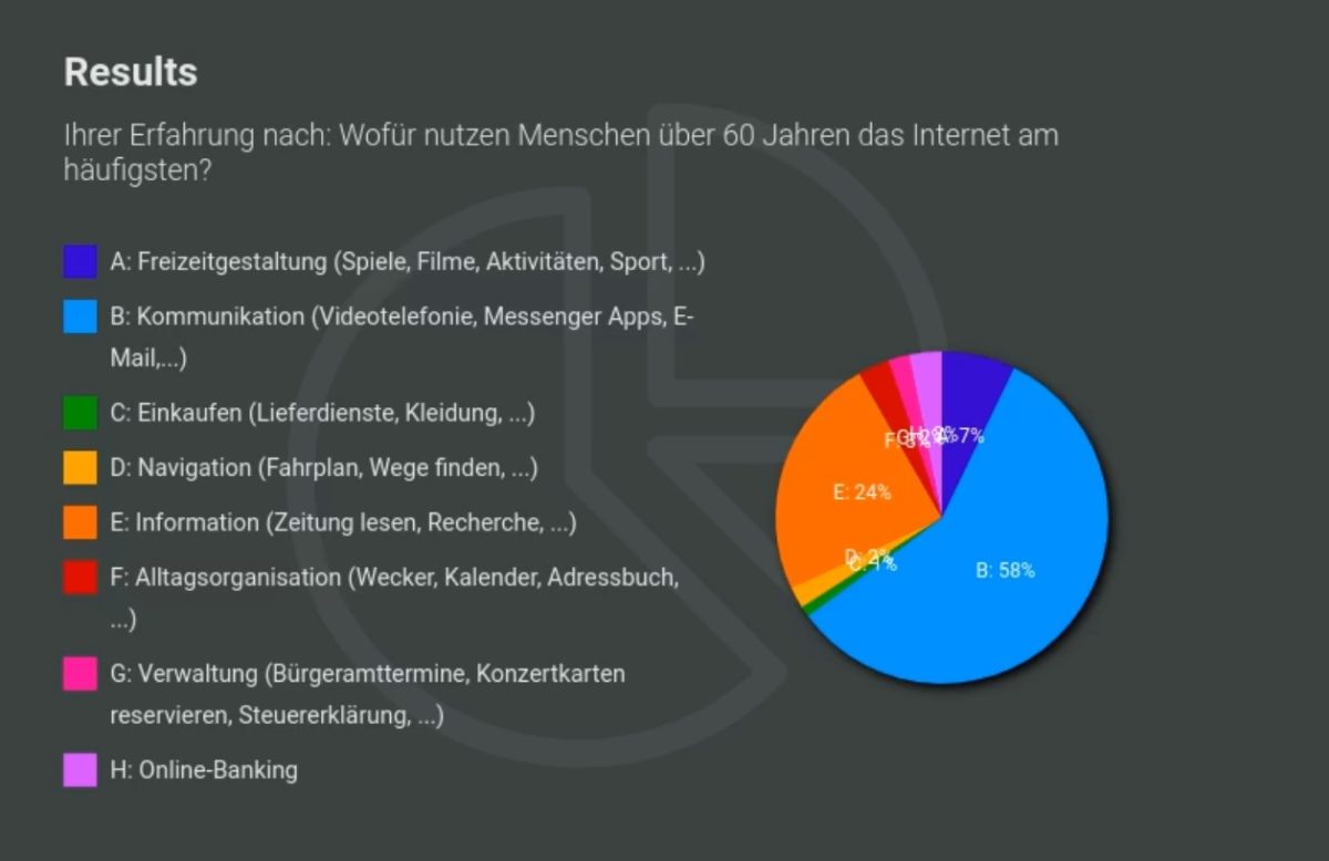 Am Anfang des Workshops wurden drei Umfragen gestellt. Die Umfrage sollte die Erfahrung und die Nutzung digitaler Technik im Alltag von den Teilnehmenden darstellen.