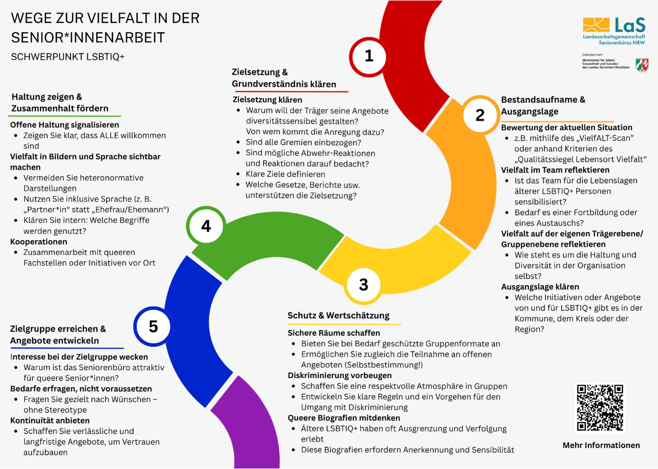 Die Landesarbeitsgemeinschaft Seniorenbüros Nordrhein-Westfalen (LaS NRW) hat neue und kostenlos zugängliche Materialien veröffentlicht, die Fachkräften, Ehrenamtlichen und Organisationen praktische Unterstützung zur bewussten Gestaltung vielfältiger Senior:innenenarbeit bietet. Die Arbeitshilfe trägt den Titel „Wege zur Vielfalt in der Senior:innenarbeit“ und gliedert sich in eine Roadmap (zu Deutsch: Fahrplan) sowie ein Booklet (zu Deutsch: Broschüre). Sie richtet sich besonders an diejenigen, die Angebote für ältere Menschen zukunftsfähig, bedarfsorientiert und inklusiv gestalten wollen.