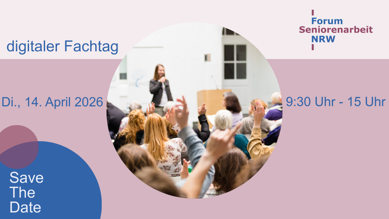 Wir laden Sie herzlich zum dritten digitalen Fachtag des Forum Seniorenarbeit NRW am Dienstag, den 14. April 2026 von 09:30 Uhr bis 15:00 Uhr, ein.